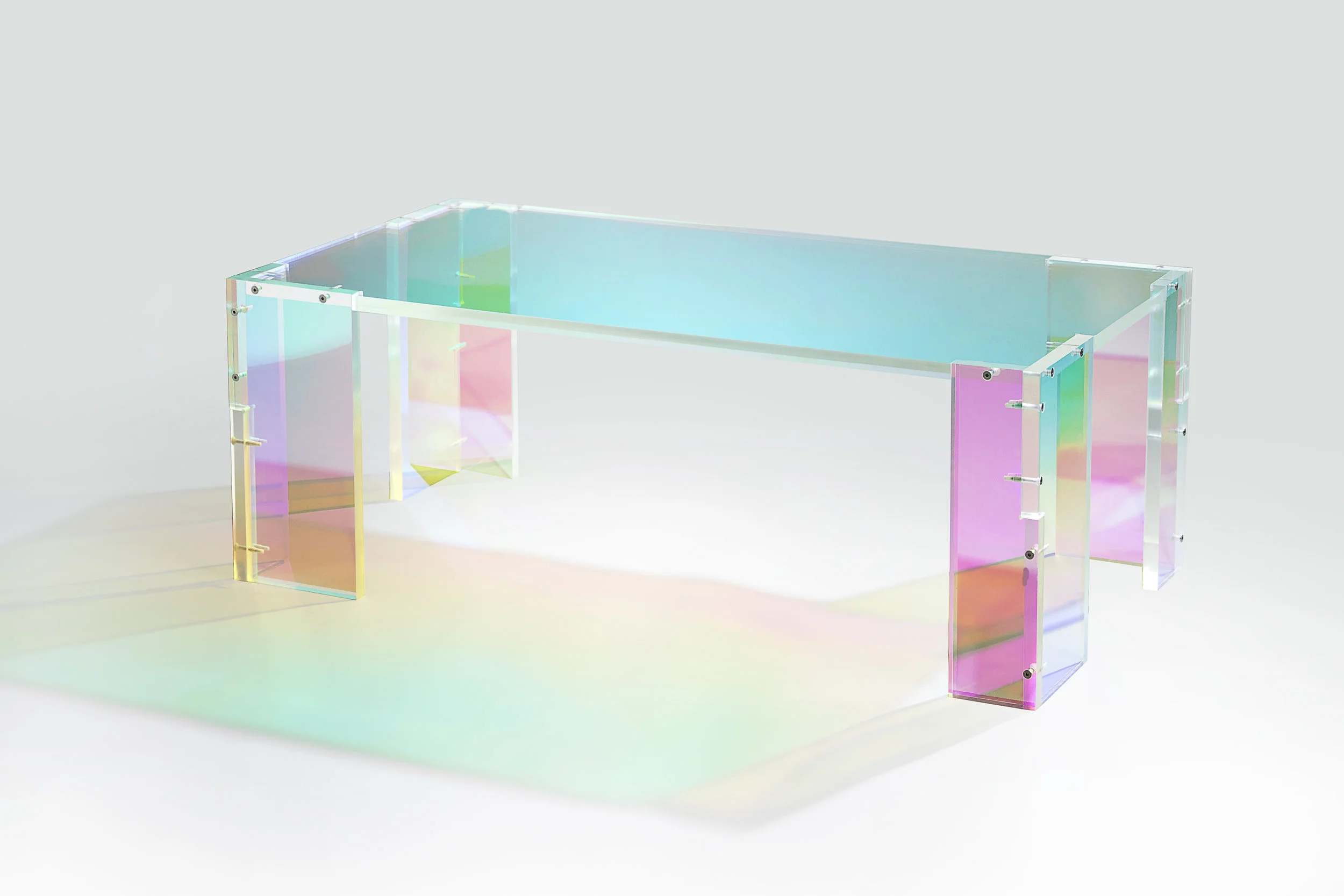 Named after the French electronic music artist Laurent Garnier, the table is made of 3/4" acrylic and is coated with a hand-applied dichroic film that casts a prismatic color spectrum from every angle. The Laurent coffee table is the perfect accent for art-forward interiors and projects.